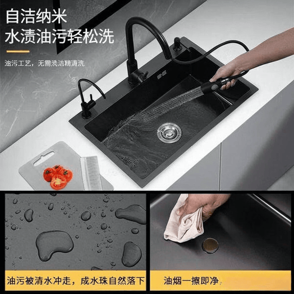 纳米防污涂层:水槽表面采用纳米防污涂层,具备出色的防污性能,日常的油渍、水渍都能轻松清洗,确保水槽始终如新。即便是高温、酸碱性物质也不易对表面造成损害,让您使用更加安心。